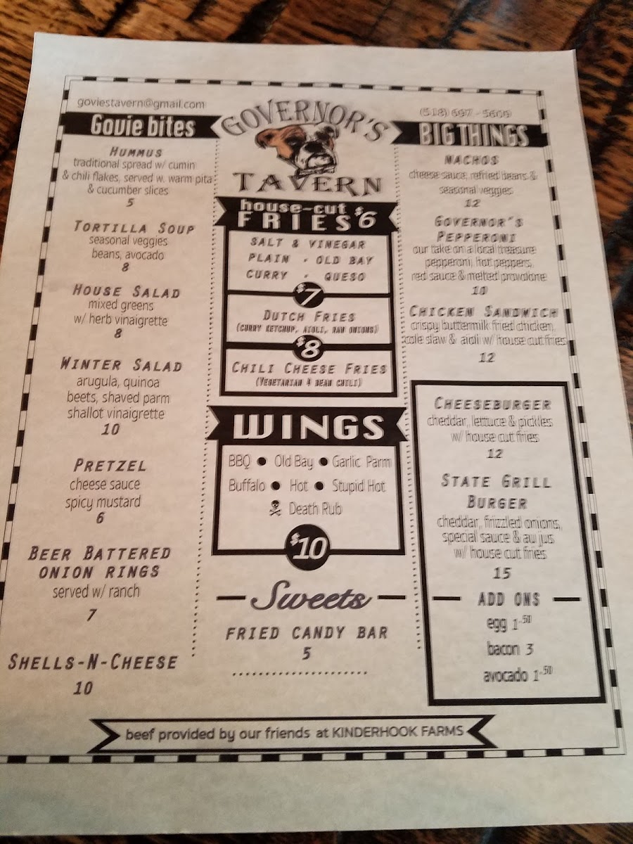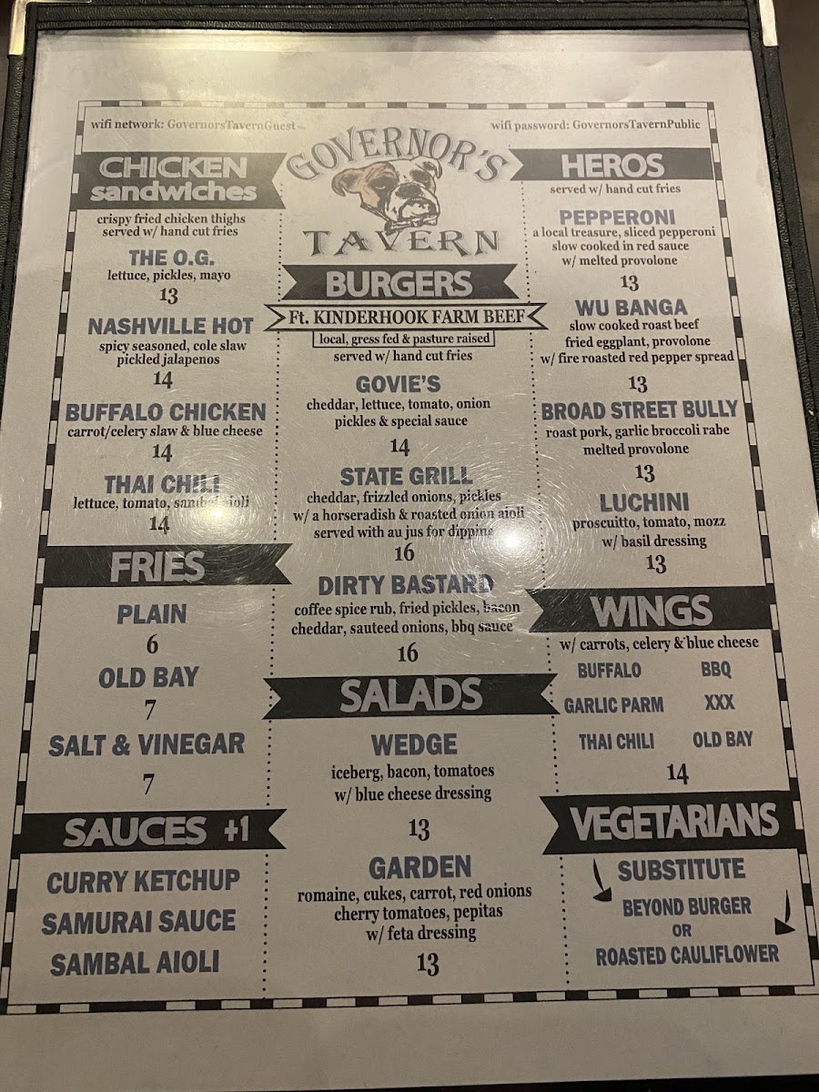 Welcome to Governor's Tavern, a charming gem nestled in Hudson, NY, where simplicity meets flavor! The menu features an enticing array of options perfect for casual dining. Start with Govie Bites like Buffalo Wings and house-made Nachos, or indulge in the creamy Artichoke Dip served with crispy tortilla chips. Vegetarians will enjoy dishes like Spring Salad adorned with citrus and goat cheese.